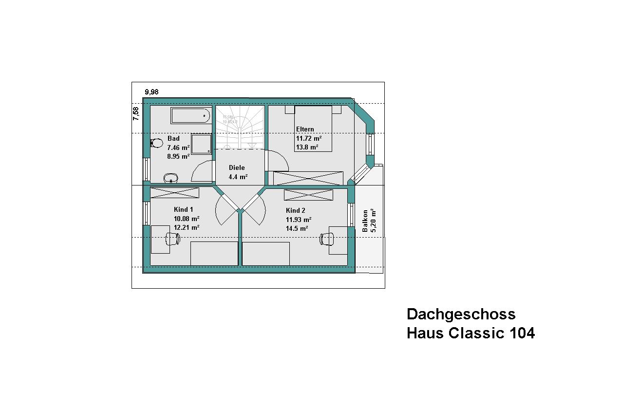Mit kompakten Außenmaßen von 7,58 x 9,88 m und einer klassischen Dachneigung von 38° fügt sich das SP – Classic 104 harmonisch in jedes Wohnumfeld ein – modern, effizient und voller Wohnqualität.